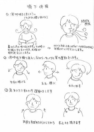 ①食事前に嚥下体操をすると咽喉を刺激し、むせたり、気道のほうに誤飲するのを防ぎます。