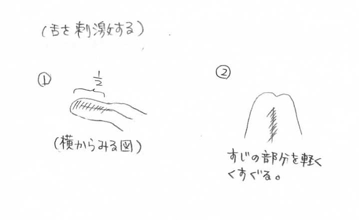 ②下の裏側をくすぐる。(唾液腺もあるので刺激するとよい)