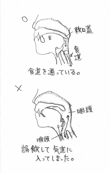 高齢者やALSの患者さんは咽喉のあたりが鈍感になっているので、むせないで、反射も鈍くなって気道をしっかりふせぎきれず誤嚥になることもあります。